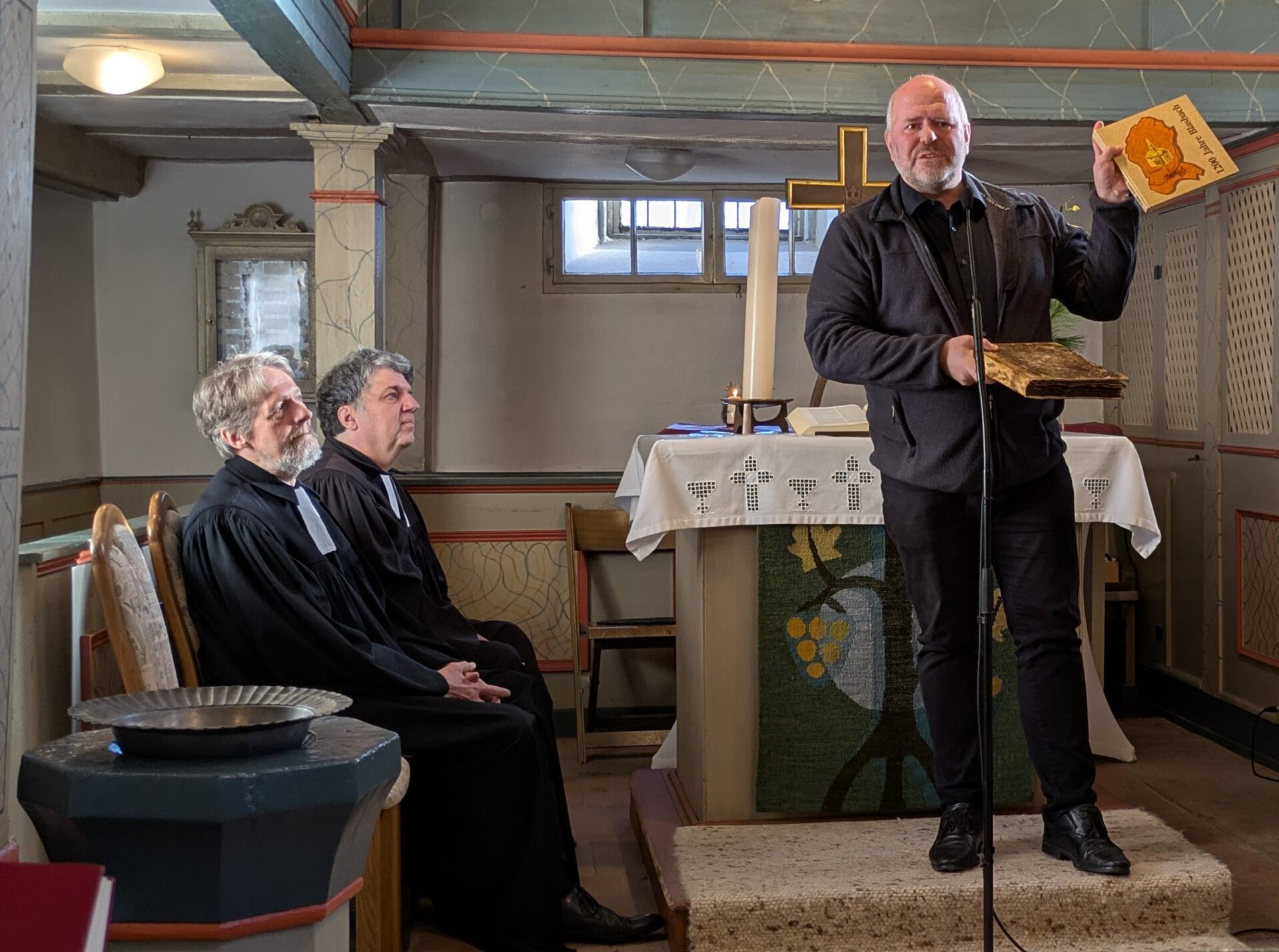 Einen besonders bewegenden Moment erlebte die Gemeinde bei der Übergabe eines der ältesten Kirchenbücher der Kirchengemeinde Blasbach. Steffen Beppler, Mitglied des Presbyteriums, überreichte das wertvolle historische Zeugnis feierlich an die Wetzlarer Pfarrer Björn Heymer und Siegfried Meier. Das Kirchenbuch steht sinnbildlich für das gewachsene Miteinander: Die Geschichte Blasbachs geht nicht verloren, sondern lebt nun in der größeren Gemeinschaft weiter.