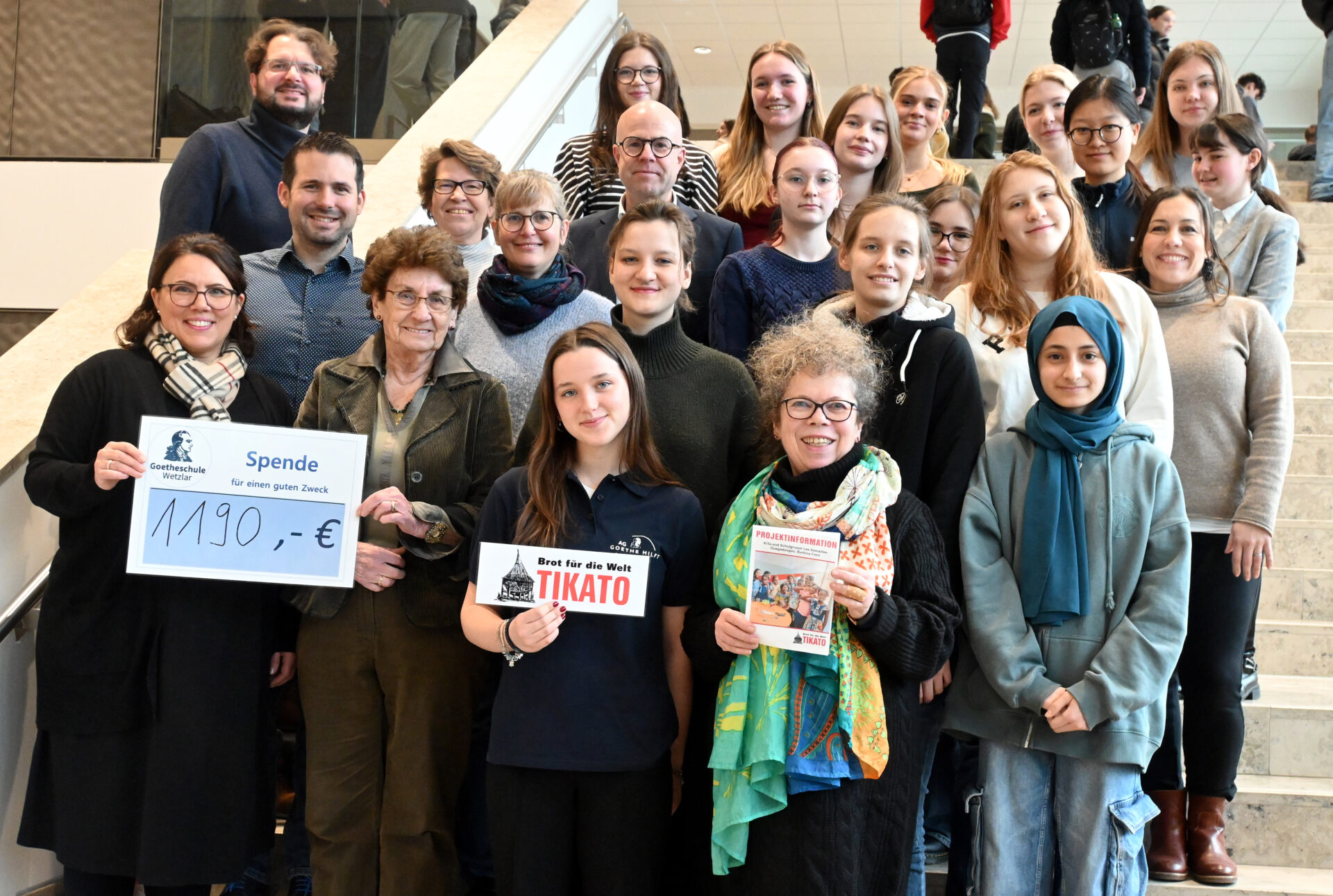 Einen Scheck in Höhe von 1190 Euro haben jetzt Mitglieder der Schulgemeinde der Goetheschule – insbesondere der romanischen Sprachen – an den Arbeitskreis Brot für die Welt-Tikato überreicht. Der Betrag ist das Ergebnis einer Spendensammlung während des Neujahrsempfangs an Wetzlars Oberstufengymnasium. Während des Neujahrsempfangs bewirtete die Schulgemeinde – getragen hauptsächlich von Kursen der Sprachen, Latein, Französisch, Italienisch und Spanisch sowie der „AG Goethe hilft“ – ihre Gäste mit einem internationalen Buffet. Im Gegenzug bat man um Spenden für den Arbeitskreis TIKATO.