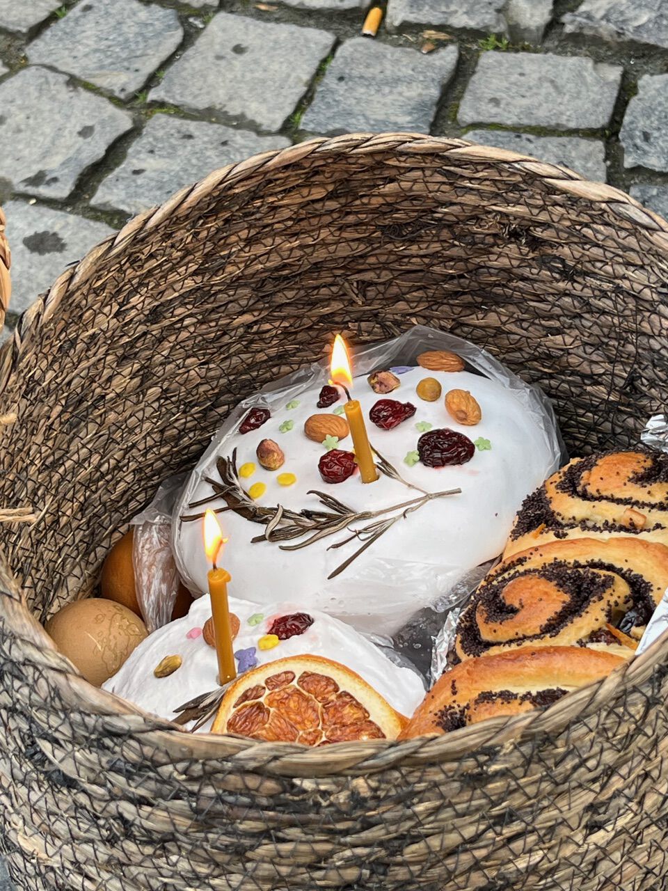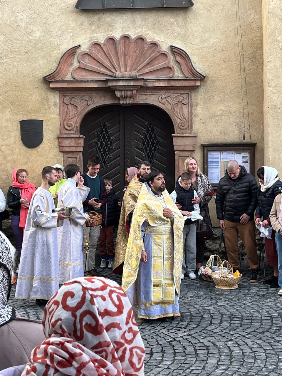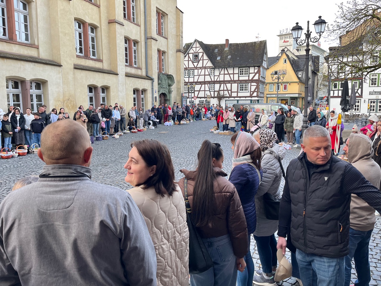Am Sonntag, dem 12. April gegen 8 Uhr morgens füllte sich der Schillerplatz in Wetzlar mit etwa zweihundertfünfzig UkrainerInnen. Sie hatten Körbchen mitgebracht und stellten sie am Boden ab. Die Tücher wurden entfernt, schmale Bienenwachskerzen, die in den frisch gebackenem Osterkuchen steckten, wurden angezündet. Kinder betrachteten genau, was sonst noch in den Körben lag – Obst und Getränke und anderen leckere Lebensmitteln. Vom Eingang der Unteren Stadtkirche begrüßt ein Priester Pavel die Anwesenden mehrmals mit dem Ostergruß „Christos voskrese“ und die Leute antworteten voistinu voskrest (Er ist wahrhaftig auferstanden). Nach einer kurzen Osteransprache zog ein kleiner Frauenchor in die Mitte und sang wiederholt einen Oster-Ruf. Der Priester und zwei Helfern gingen an den Wartenden mit einer Schale voll Wasser vorbei. Mit einem Wedel besprengte der Priester die Gläubigen und ihre mitgebrachten Gaben. Als der ukrainische Priester deutsche Besucher erkannte, begrüßte er sie mit: „Der Herr – auferstanden!“ Sie antworteten laut hörbar: „Er ist wahrhaftig auferstanden!“
