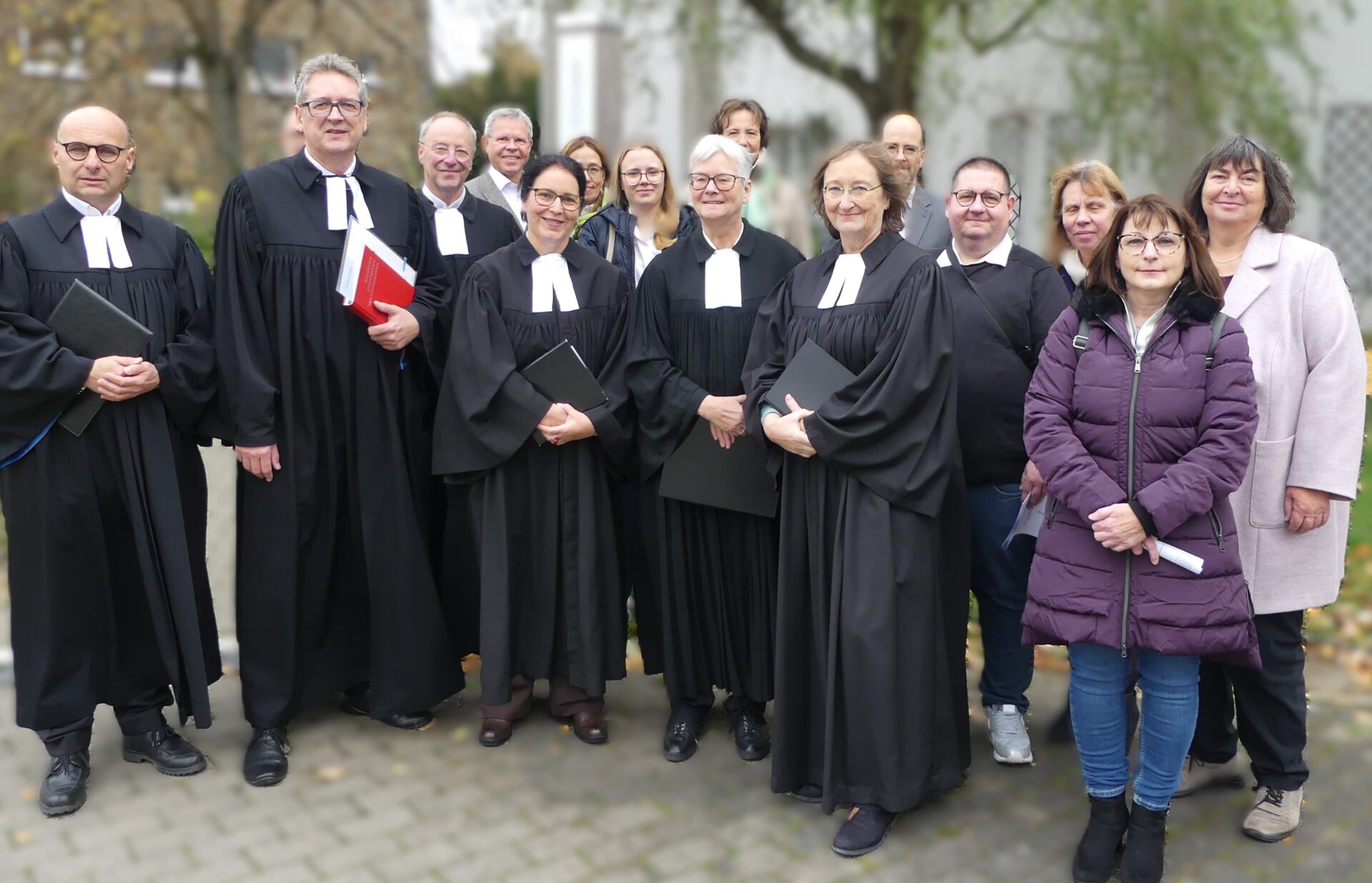 FOTO 1: Prädikantin Sabine Schäfer (4. v. l.) umgeben von allen Beteiligten des Ordinationsgottesdiensts sowie den Mitgliedern des Presbyteriums und des Bezirksausschusses.
